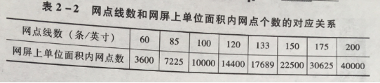 按公式M=N2计算,网屏上网点线数和单位面积内网点个数的对应关系如表2-2所示。