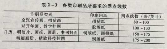 印刷品的网点线数的选择,取决于印刷品的类别以及纸张的种类和表面状况。表2-3列出了不同印刷品、不同纸张所常用的网点线数。印版和印刷品的网点线数,可用网点线数尺来测量。