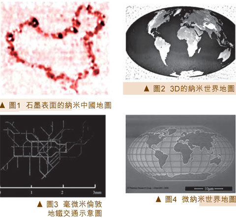 微纳米地图是近年来出现的新生事物。微纳米地图可分为平面图(图1)和立体图(图2)。图1是中科院化学所的科学家利用扫描隧道显微镜(STM)探针针尖在石墨表面施加电压,从而刻蚀的平面纳米级中国地图,地图的线粗细约为10μm,整体尺寸为数百纳米。图2是美国IBM公司科学家近日研发的3D纳米世界地图。该图基于高分子聚合物的表面,约22μm×11μm,共包含5 0 万个像素, 每个像素的面积为20μm2。海拔1000m的山脉在图中高度只有8μm,也就是说珠穆朗玛峰在图中也只有64μm高。